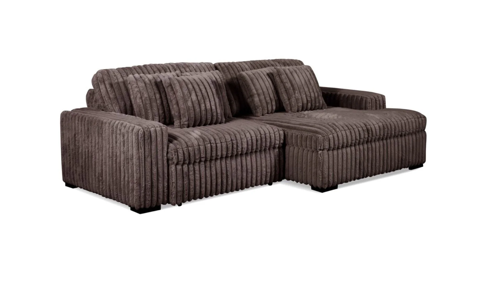 Presley Fog/Chocolate brown offer quality construction, soft & comfortable seating, and tremendous support. Features transitional track arm styling in a beautiful wide corduroy feau fur fabric. The LAF slider seat allows you relax in comfortable dual chaise seating.